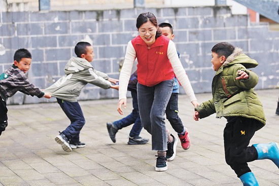 4月27日,在贵州省锦屏县三江镇潘寨大公田易地扶贫搬迁安置小区,志愿者带着孩子们玩“老鹰抓小鸡”游戏、下五子棋、指导小学生观察龙虾的特征。