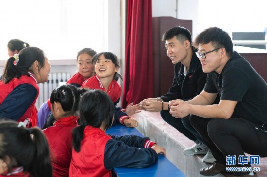 在黑龙江省安达市任民镇中心小学,“村里的孩儿”音乐班的孩子结束中午的合唱训练后和老师交流(5月25日摄)。