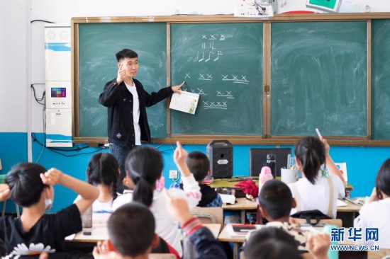 在黑龙江省安达市任民镇中心小学,音乐老师李平在教室里上音乐课(5月25日摄)。