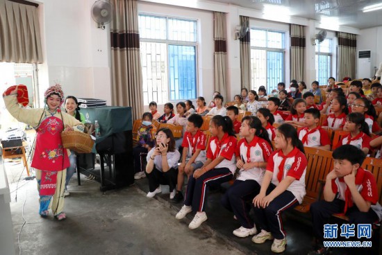 6月3日,演员在资兴市鲤鱼江完全小学为学生表演花鼓戏。
