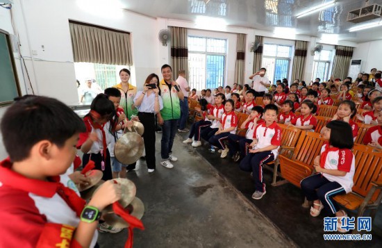 6月3日,资兴市鲤鱼江完全小学学生在体验使用花鼓戏表演所需的伴奏乐器。