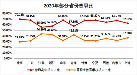 记者翻看了2020年各省《国民经济和社会发展统计公报》发现,2020年北京市的普通高中招生占比也是70%,而江苏省普通高中招生占比也达到了56%,而其他地区招生普职比大多在7∶3与5.6∶4.4之间。