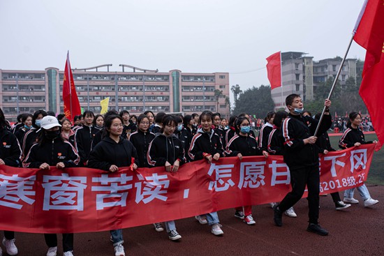 3月9日,高考誓师大会现场,我们班的学生举着横幅和班旗,列队准备走过主席台。横幅上写着“同是寒窗苦读,怎愿甘拜下风”。