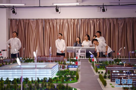 天津大学智能与计算学部的学生在沙盘教室内调试设备(6月16日摄)。