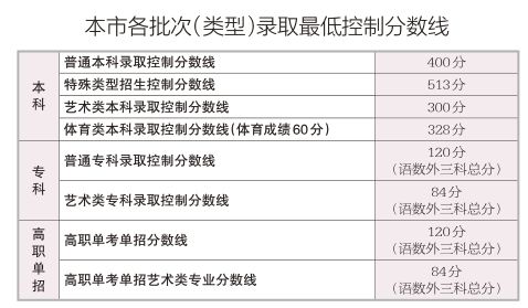 今年高招本科批次中,普通本科录取控制分数线为400分,特殊类型招生控制分数线为513分,艺术类本科录取控制分数线为300分,体育类本科录取控制分数线(体育成绩60分)为328分。