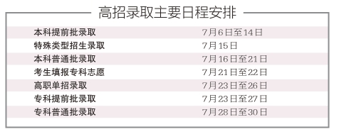 明天至7月1日,统考考生填报本科志愿,单考考生填报单招志愿。7月21日至22日,专科志愿填报。录取工作于7月6日至30日进行。