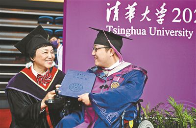 本报讯 昨天上午,清华大学在东大操场举行2021年本科生毕业典礼。毕业生魏祥坐在轮椅上,由校党委书记陈旭拨穗,圆满完成了在清华的本科学业。4年前,残疾新生魏祥因为向清华写信求“一间陋宿供母子俩济身”,并获得清华招办公开回信而感动了万千网友。如今他本科顺利毕业,并获得直接攻读博士学位的资格,将回到家乡甘肃继续攻读博士学位。