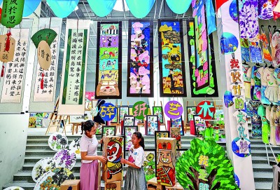 近年来,山东省荣成市加大公益性教育文化设施投资建设力度,为青少年提供更加优质的活动场所和教育资源,满足学生课外生活需求,让学生快乐学习、健康成长。图为7月8日,学生在荣成市青少年活动中心学非遗手艺,快乐过暑假。杨志礼摄/光明图片