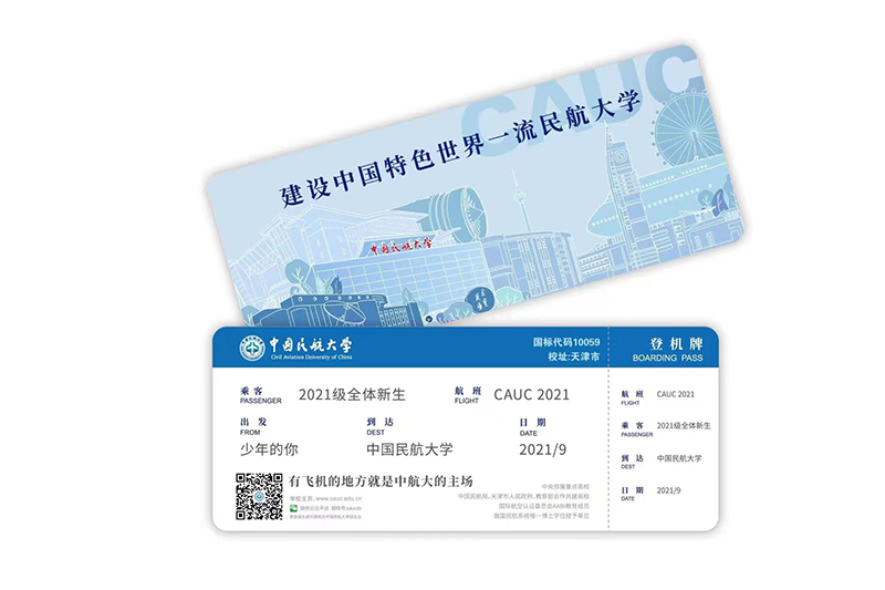 中国民航大学的录取通知书展现出中航大发展70年的时间脉络,翻开纪念夹,其中有一张送给2021级全体新生的直达中国民航大学的虚拟登机牌与建校70年定制版邮票。将录取通知书、纪念邮票和登机牌一一取出时,美丽的中航大校园风景便映入眼帘。