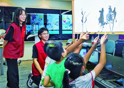 7月8日,在浙江慈溪市“星星点灯”暑期公益课堂上,学生们用自己制作的皮影作品进行趣味表演。 新华社发