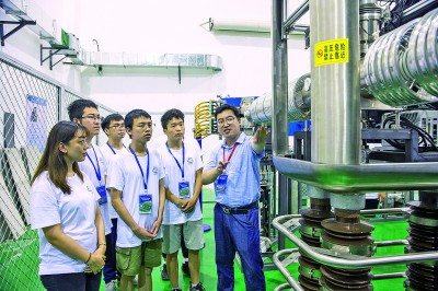 7月13日,中国原子能科学研究院2021年度优秀大学生夏令营在江西省瑞昌市开营,来自清华大学、四川大学、兰州大学的30多名大学生走进中国原子能科学研究院瑞昌核物理应用研究院,近距离与“核”接触。在为期4天的活动中,大学生们将参加核数据技术、加速器及其应用、辐射效应等专题学术交流。开办此次夏令营的目的是吸引优秀大学生投身国家物理核技术行业,为我国核事业的发展作贡献。图为大学生们在中国原子能科学研究院瑞昌核物理应用研究院参观电子加速器辐照中心。(魏东升)