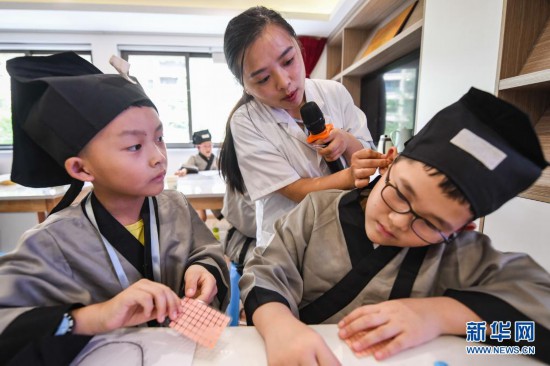 7月14日,在成都市武侯区竹园社区,志愿者为小朋友示范贴耳穴贴。