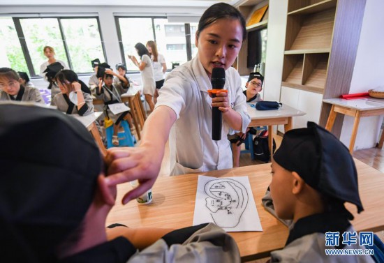 7月14日,在成都市武侯区竹园社区,志愿者为小朋友讲解耳穴图。