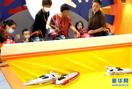 7月16日,小朋友们在家人的陪伴下体验水上救援游戏。