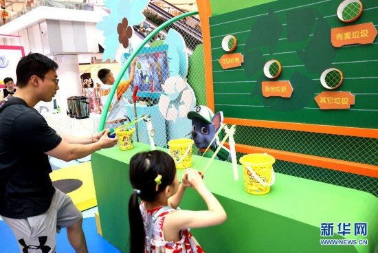 7月16日,小朋友在家人的陪伴下体验垃圾分类游戏。