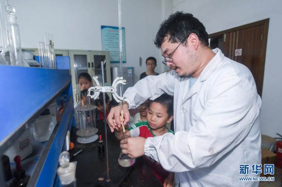 7月29日,在位于东林镇的浙江金甲饲料有限公司内,员工子女参观企业实验室。新华社记者 徐昱 摄