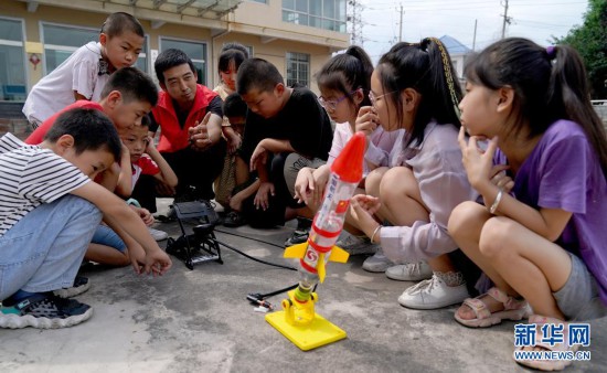 7月28日,在陕西铜川王家砭村“复兴少年宫”的科创课上,志愿者为孩子们讲解“水火箭”的原理。
