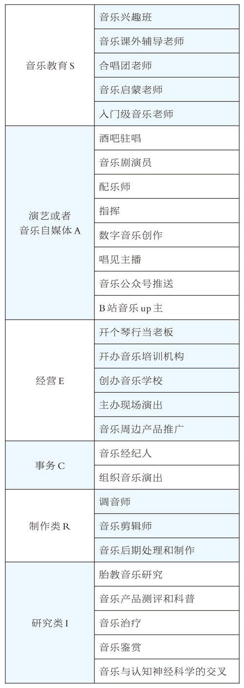 正因如此,我才会把开头的“音乐之路”按照六个方面进行划分,同样在很多领域,我们都可以采用这种思路解决问题。比如有的孩子有绘画特长,但是又不够高水平,怎么办呢?如果想做跟人打交道的工作(S),就去当美术老师,如果想做跟商业有关的工作(E),就去做艺术品经销,如果要做跟事务有关的(C),那就做艺术展览的组织和策划……