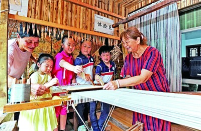 在浙江湖州南浔区辑里村湖丝博物馆,小朋友体验手工缂丝技艺。新华社发