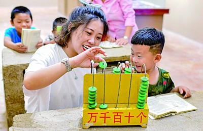 在内蒙古赤峰市巴林左旗大良沟村乡村博物馆,参观者在体验传统计数器。新华社发