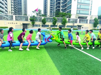 北师大教育集团资源服务学校珠海高新区金凤小学内,学生们在体验旱龙舟。光明图片