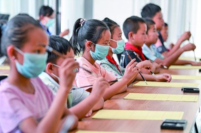 宁夏银川兴庆区掌政镇新创家园社区内,学生在公益暑托班学习书法。新华社发
