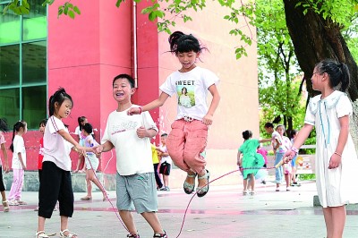 江西赣州兴国县实验小学,暑期校内托管的学生们在参加体育锻炼。陈鹏摄/光明图片