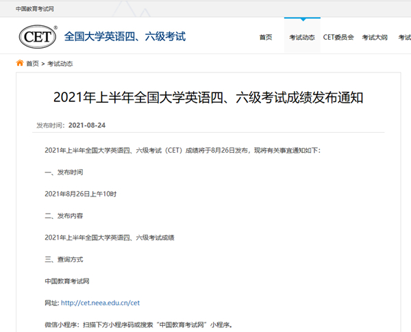 2021年上半年全国大学英语四、六级考试成绩8月26日发布