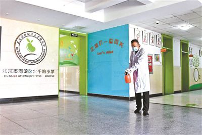 8月26日,在北京市海淀区太平路小学,工作人员对教学楼楼道进行消毒 供图/新华社