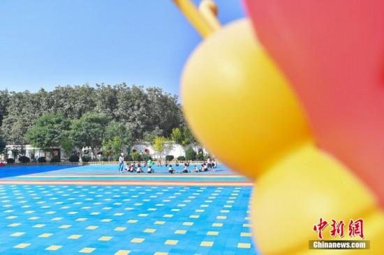 9月27日,新疆和田县布扎克乡库木村幼儿园,小朋友和老师一起在做游戏。当日,据该幼儿园园长维吾尔族姑娘阿尔孜古丽·阿力木介绍,该园由北京市援建,可容纳300名学生,目前有14名教师。 中新社记者 李雪峰/文 中新社记者 田雨昊/摄