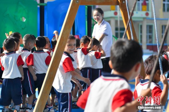 9月27日,新疆和田县布扎克乡库木村幼儿园,小朋友在嬉戏玩耍。当日,据该幼儿园园长维吾尔族姑娘阿尔孜古丽·阿力木介绍,该园由北京市援建,可容纳300名学生,目前有14名教师。 中新社记者 李雪峰/文 中新社记者 田雨昊/摄