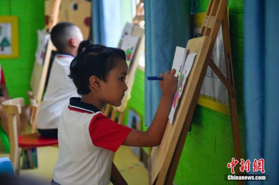 9月27日,新疆和田县布扎克乡库木村幼儿园,小朋友在画画。当日,据该幼儿园园长维吾尔族姑娘阿尔孜古丽·阿力木介绍,该园由北京市援建,可容纳300名学生,目前有14名教师。 中新社记者 李雪峰/文 中新社记者 田雨昊/摄