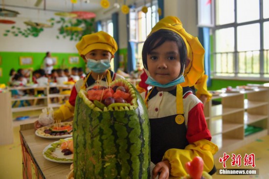 9月27日,新疆和田县布扎克乡库木村幼儿园,小朋友在制作水果拼盘。当日,据该幼儿园园长维吾尔族姑娘阿尔孜古丽·阿力木介绍,该园由北京市援建,可容纳300名学生,目前有14名教师。 中新社记者 李雪峰/文 中新社记者 田雨昊/摄