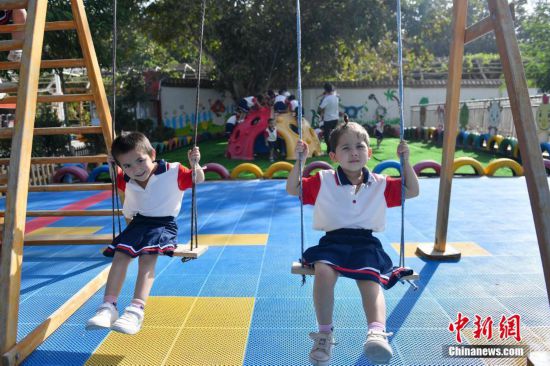 9月27日,新疆和田县布扎克乡库木村幼儿园,小朋友在荡秋千。当日,据该幼儿园园长维吾尔族姑娘阿尔孜古丽·阿力木介绍,该园由北京市援建,可容纳300名学生,目前有14名教师。 中新社记者 李雪峰/文 中新社记者 田雨昊/摄