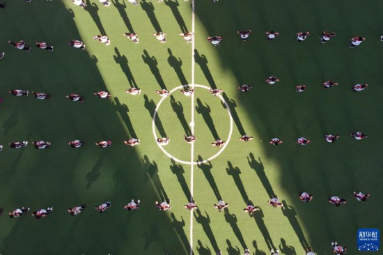 10月8日,哈尔滨市群力兆麟小学的学生在上课间操(无人机照片)。