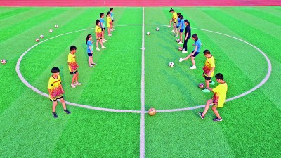今年以来,河北省唐山市丰南区积极落实“双减”政策,深化课后服务全覆盖,结合学生兴趣爱好,广泛开设体育、艺术、音乐、舞蹈、科技、阅读等多样化课程,促进学生素质全面发展。图为10月11日,在河北省唐山市丰南区蒲子泊小学,学生们在操场上进行足球训练。李秀清摄/光明图片