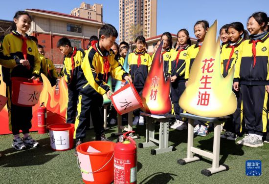 11月8日,山东省枣庄市市中区东湖小学的学生在操场上做消防趣味游戏。