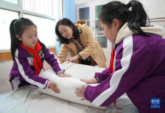 11月10日,平利县城关第三小学3年级1班的学生在学校内务整理室内学习叠被子。