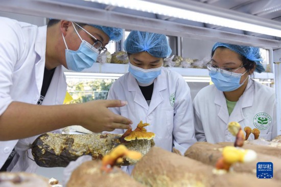 11月11日,在湖州市现代农业技术学校的灵芝培育室,老师(左)向学生介绍培育灵芝的注意事项。
