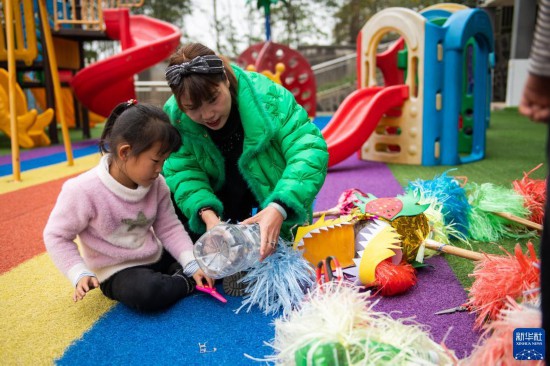 11月17日,在尧天坪镇幼儿园,老师指导学生手工制作舞龙道具。新华社记者 陈思汗 摄