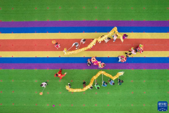 11月17日,在尧天坪镇幼儿园,孩子们在龙狮艺人的带领下进行龙狮训练(无人机照片)。新华社记者 陈思汗 摄