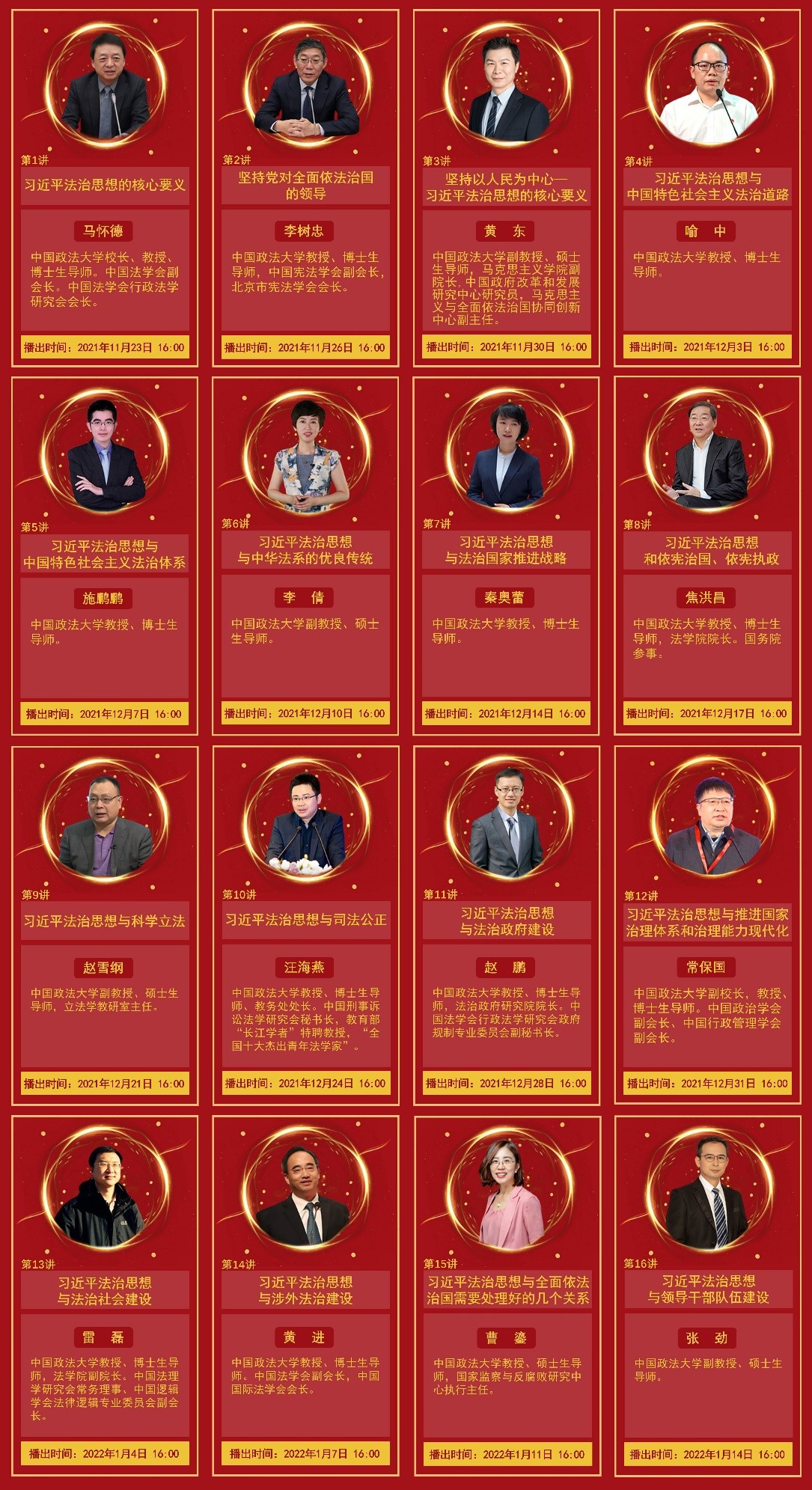 据介绍,相关课程及播出时间可通过中国政法大学继续教育学院微信公众号(fdjxjycupl)、继续教育学院官网(http://fdjxjy.cupl.edu.cn/)、网络教育学院学习平台(http://wljyxy.cupl.edu.cn/index.php?catid=67)登录观看。