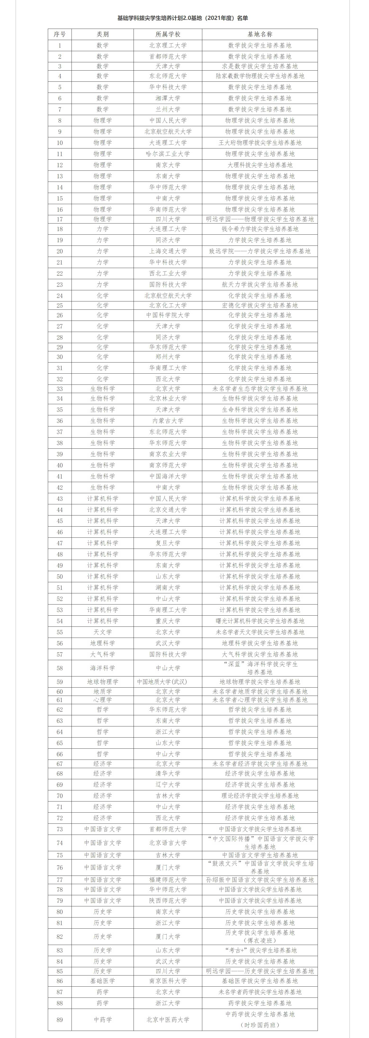好博体育北京11月30日电 (记者孙竞)11月29日,教育部发布公告,在前两批遴选建设199个基础学科拔尖学生培养基地的基础上,确定了基础学科拔尖学生培养计划2.0基地(2021年度)名单。