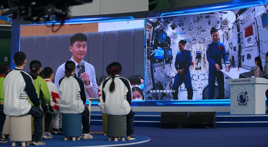 12月9日,中国空间站“天宫课堂”第一课正式开讲,此次授课活动在中国科技馆设地面主课堂,在广西南宁、四川汶川、香港、澳门分设4个地面分课堂,共1420名中小学生代表参加现场活动。图为青少年向航天员提问。中国科技馆供图
