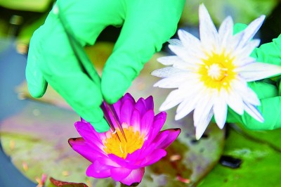 湖北武汉市园林科学研究院里,科研人员在睡莲科研池进行人工授粉。新华社发