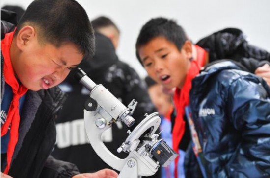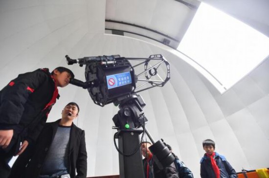 1月19日,在湖南省浏阳市小河乡的星河天文台,学生(左一)在工作人员的指导下体验天文望远镜。新华社记者 陈泽国 摄