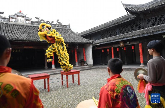 1月21日,在前童古镇祠堂,古镇舞狮队在训练。