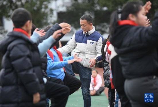 1月21日,在前童镇中心小学,童攀峰(中)带领学生们开展舞狮基本动作训练。