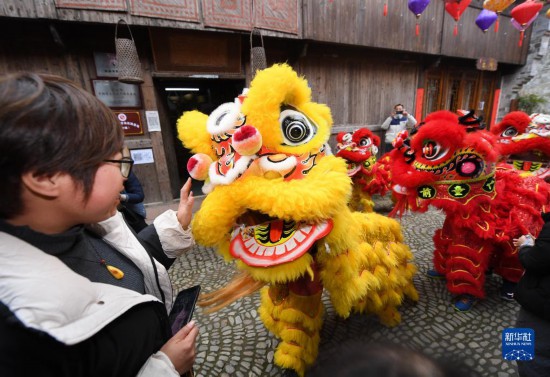 1月20日,在前童古镇老街上,正在训练的舞狮队和游客互动。