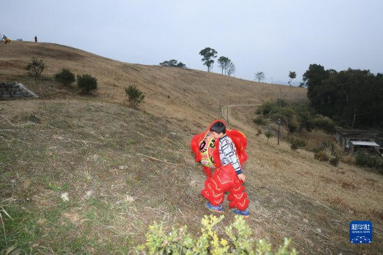 1月20日,在前童古镇边的小山上,11岁的季宇坤在赶路前去参加训练。